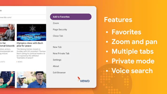 Scopri Web Browser by Vewd, il modo più facile e veloce per navigare in Internet direttamente dalla tua TV. Vivi un'esperienza ottimizzata con pagine caricate rapidamente e adattate al grande schermo. Accedi ai tuoi siti preferiti, guarda video, notizie e social media comodamente dal salotto.